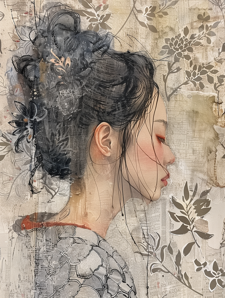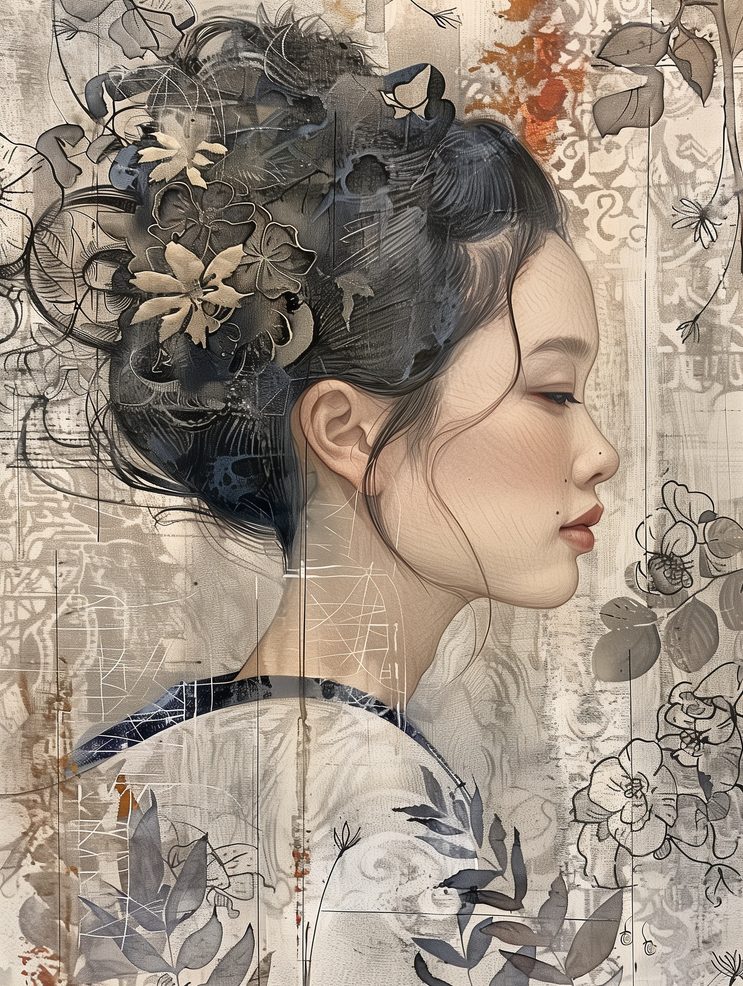 "Élégance Botanique" enveloppe la silhouette féminine dans des motifs floraux stylisés et des couleurs apaisantes, créant une ambiance de calme et de contemplation, révélant la grâce et la tranquillité. L'intensité des contrastes et la finesse des détails ajoutent une dimension unique à cette composition.