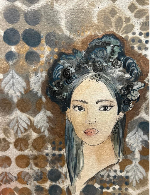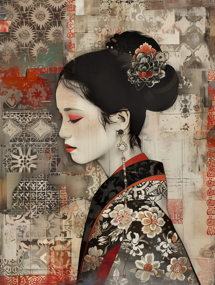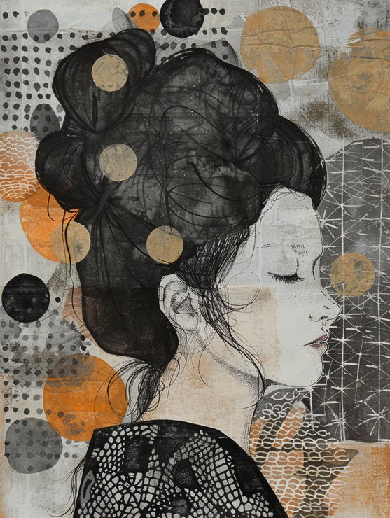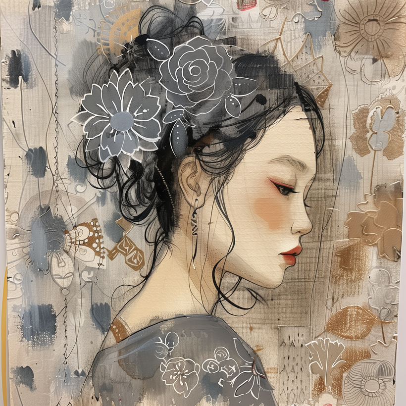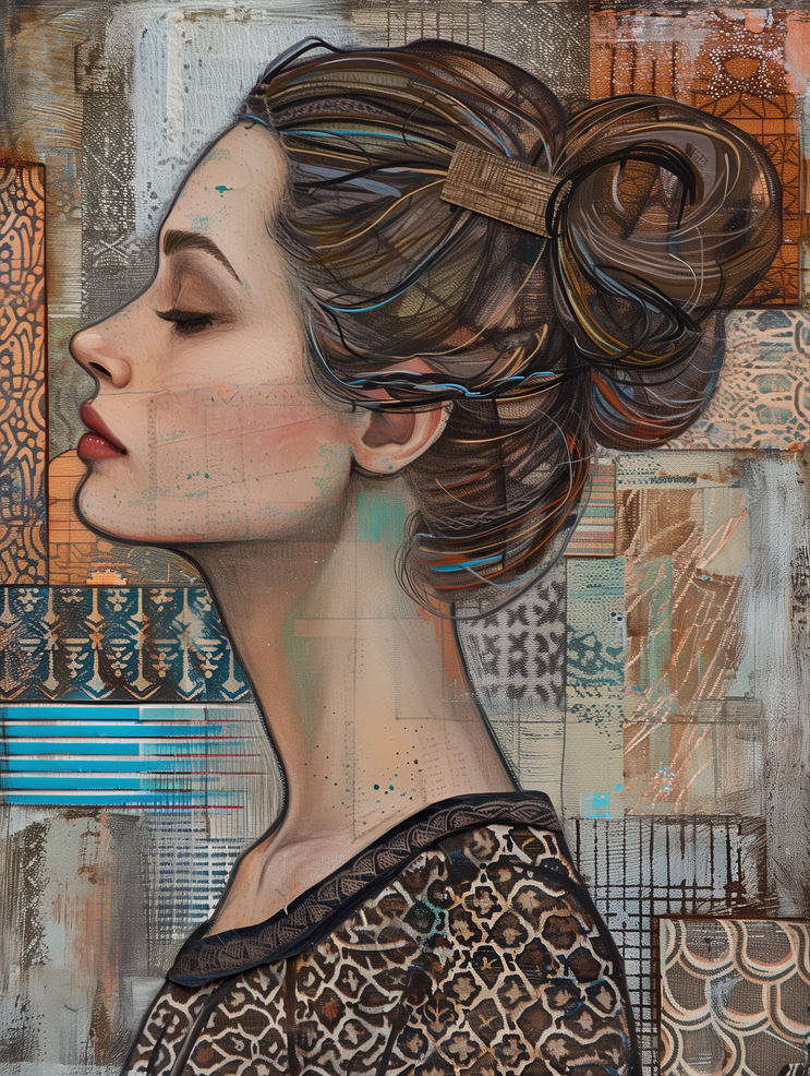 "Beauté Intemporelle" capture la silhouette féminine avec des motifs subtils et des teintes apaisantes, évoquant une ambiance de sérénité et de mystère, révélant la beauté et la complexité de l'âme.